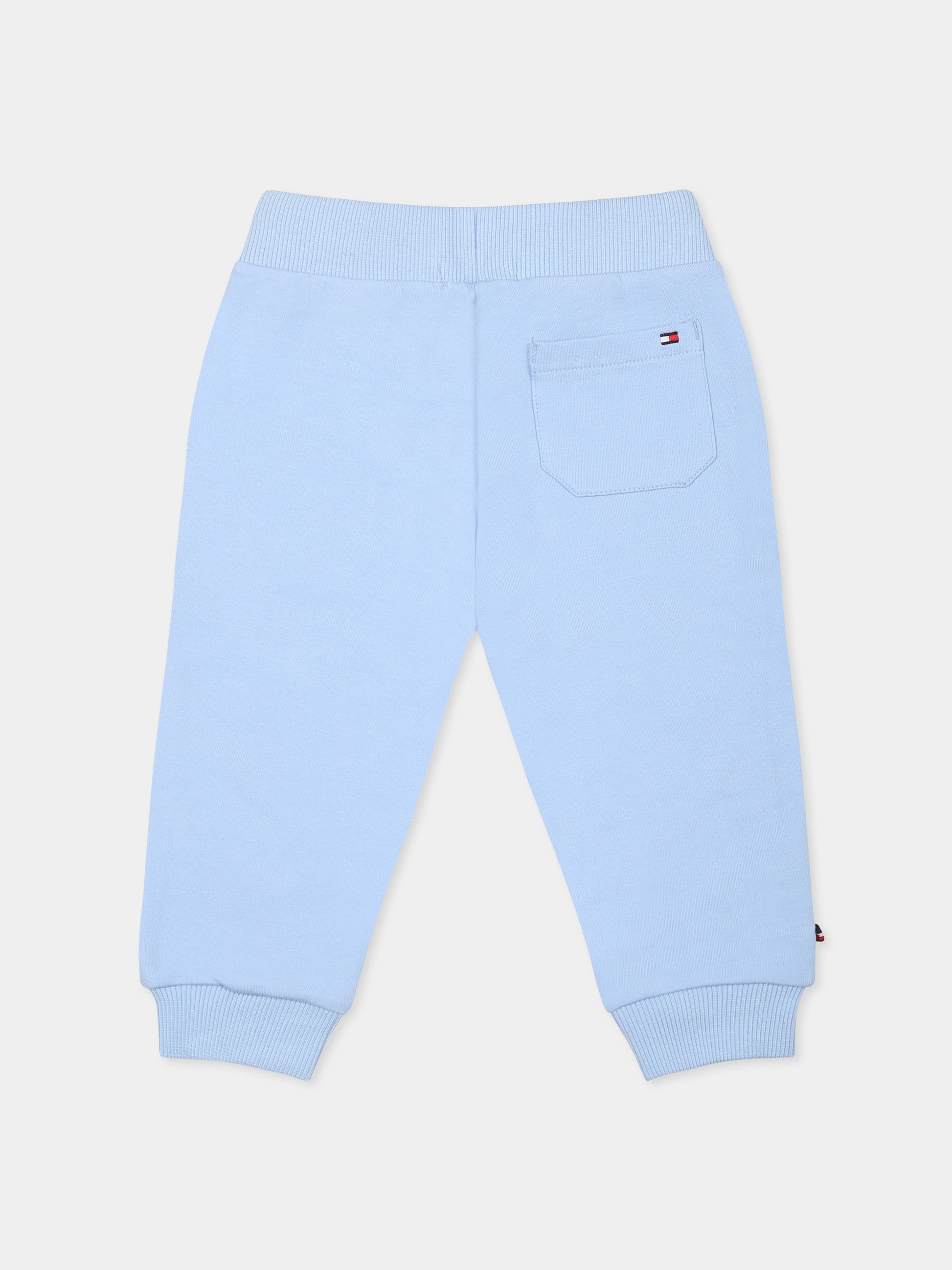 Colore: Celeste Descrizione: Pantaloni celeste in misto cotone organico, garzati, con vita elasticizzata, coulisse, tasche laterali, tasca applicata sul retro e caviglie a costine. Sono decorati con logo stampati su una gamba e iconica bandierina ricamata sul retro. Dettagli: 95% Cotone organico, 5% Elastan. Lavare a 30°C.