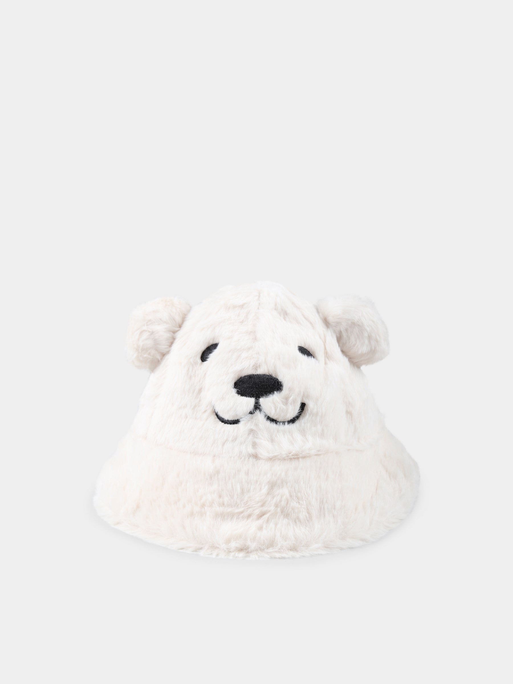 Colore: Avorio Descrizione: Cloche avorio in ecopelliccia, a forma di orso, con orecchie applicate sulla parte superiore. È decorata con occhi e bocca ricamati sulla parte anteriore e con logo ricamato sul retro. Dettagli: 100% Poliestere. Lavare a 30°C.