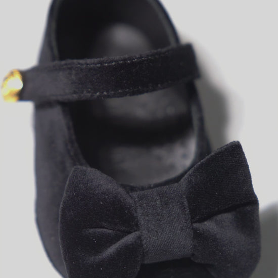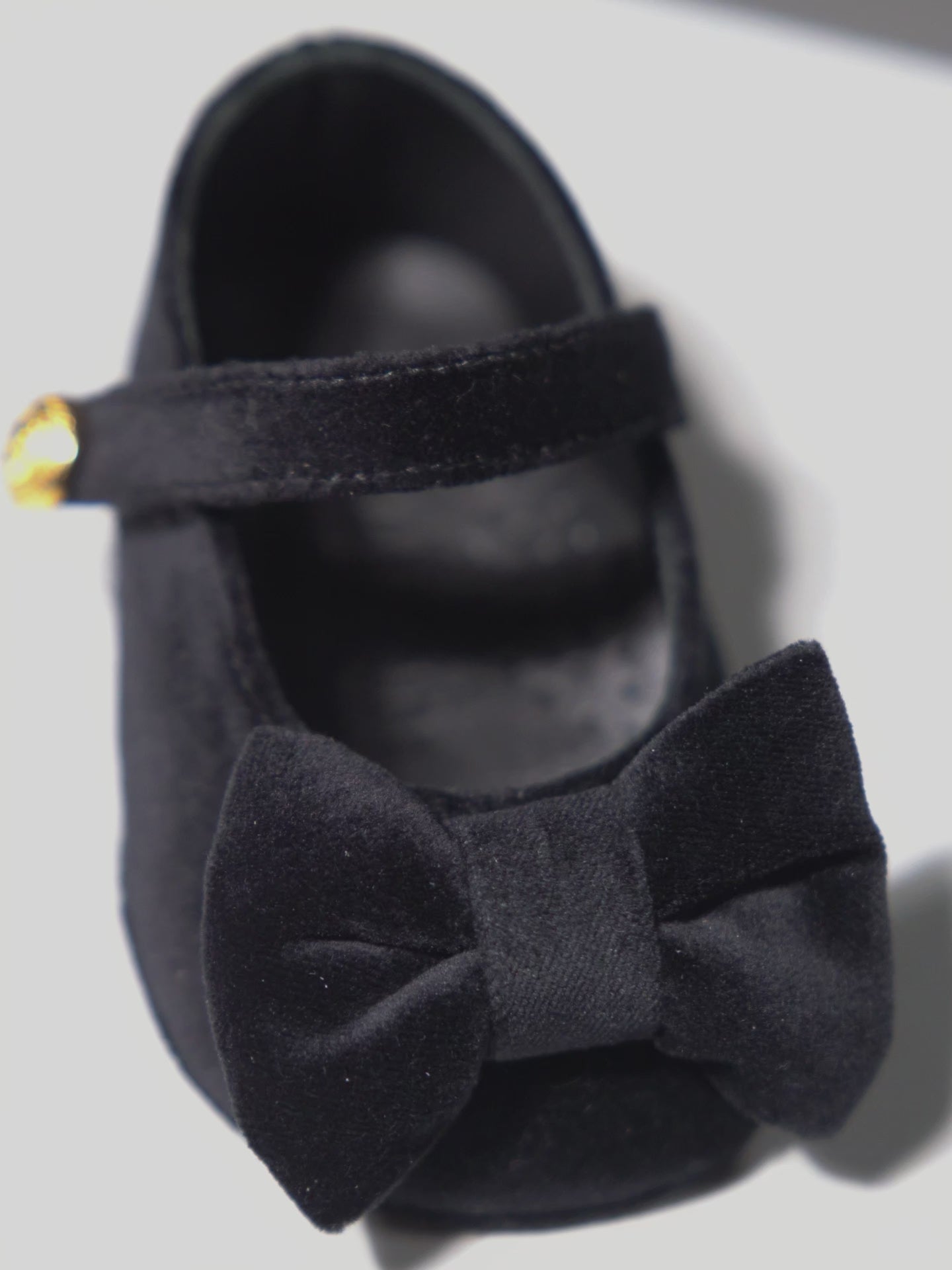 Colore: Nero Descrizione: Ballerine nere in velluto, con cinturino alla caviglia, chiusura a strappo e iconico bottone oro su un lato. Sono decorate con fiocco applicato sulla parte anteriore. Made in Italy Dettagli: 100% Pelle.