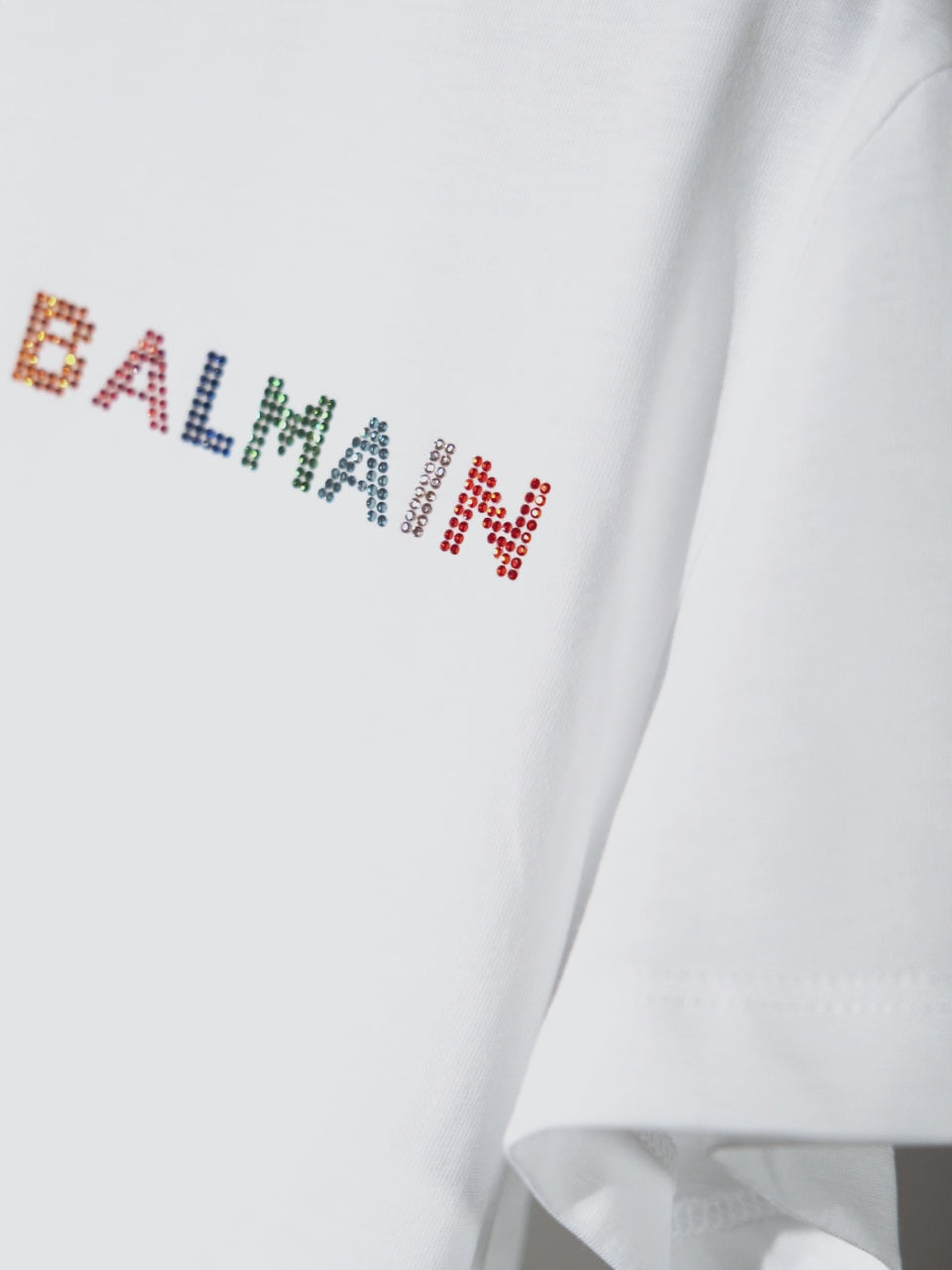 Colore: Bianco Descrizione: T-shirt bianca in cotone organico, con maniche corte e girocollo a costine. È decorata con logo Balmain di strass multicolor sul petto. Dettagli: 100% Cotone organico. Lavare a mano.
