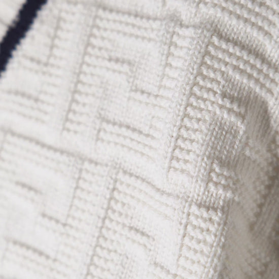 Colore: Avorio Descrizione: Cardigan avvorio, con scollo a V, realizzato in morbido filato di cotone con logo Ff all-over nelle stesse tonalità; presenta chiusura con bottoni, polsini e profilo a costine con dettaglio blu, e bande multicolor sulle maniche. Made in Italy Dettagli: 100% Cotone. Lavare a mano.