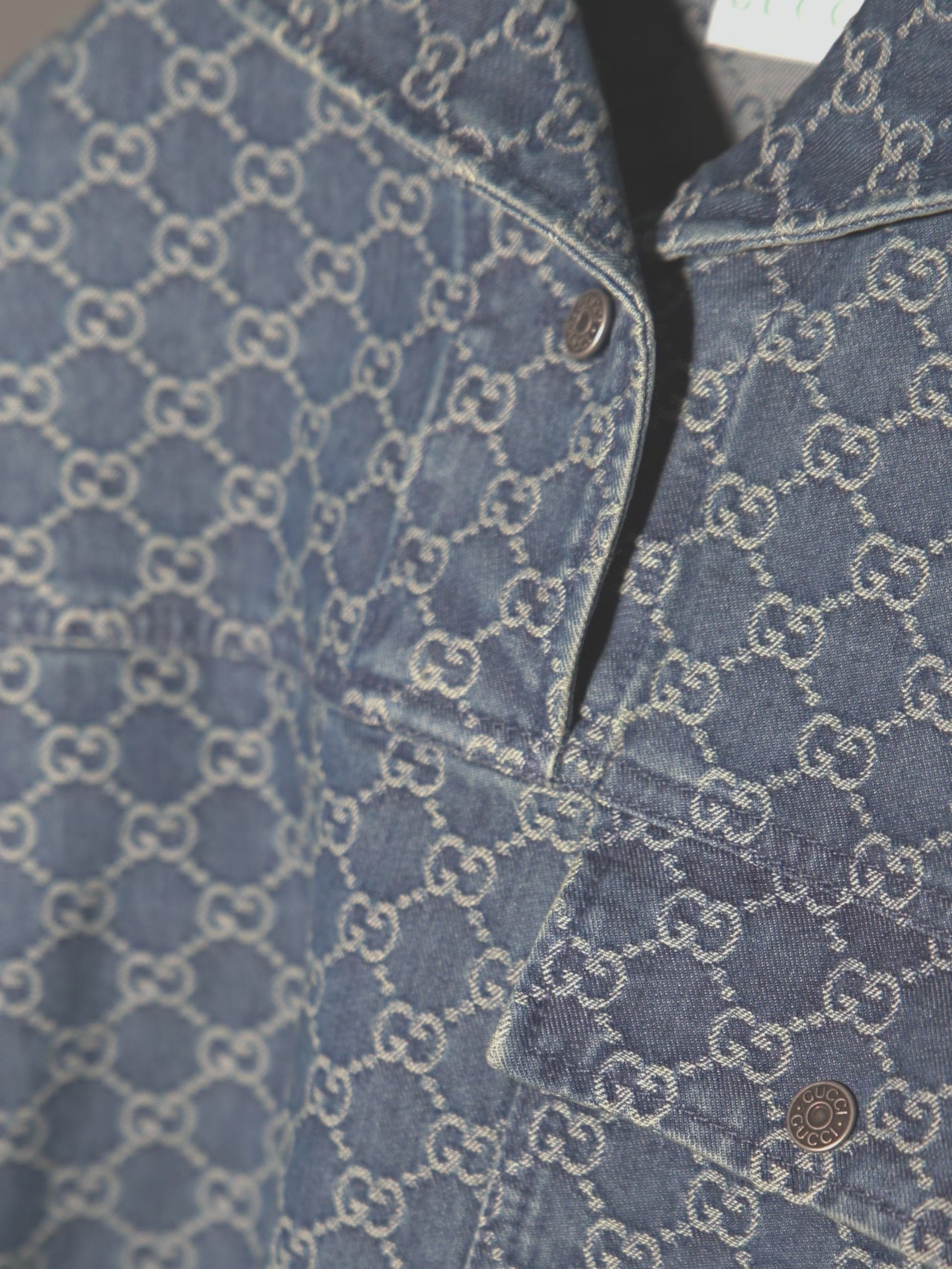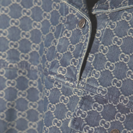 Colore: Denim Descrizione: Vestito denim del luxury brand Gucci Kids, realizzato in cotone jacquard. Presenta maniche corte, colletto a punta e tasca con patta sul petto. Si chiude con bottoni logati sul davanti. È decorato con iconico motivo GG all-over a contrasto. Made in Italy Dettagli: 100% Cotone. Lavare a 30°C.