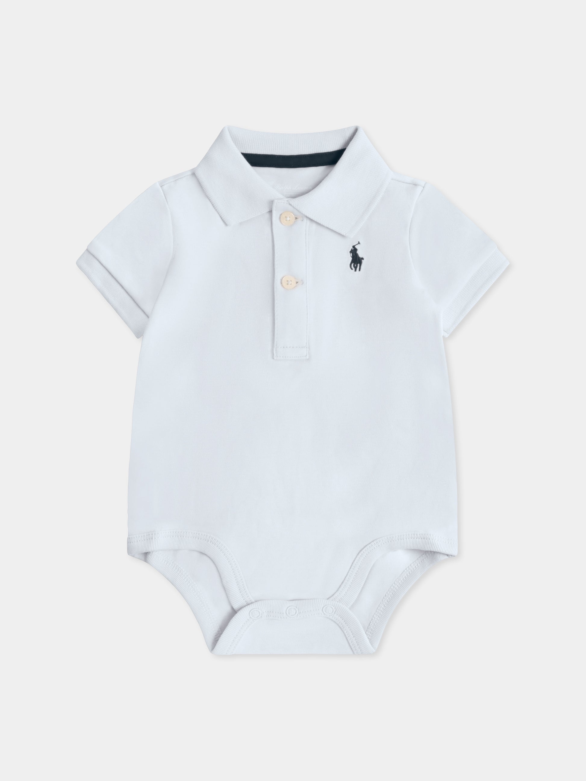 Colore: Azzurro Descrizione: Body azzurro in cotone, a maniche corte, con colletto classico, chiusura frontale con bottoni e bottoni automatici tra le gambe. È decorato con iconico cavallino blu ricamato sul petto. Dettagli: 100% Cotone. Lavare a 30°C.