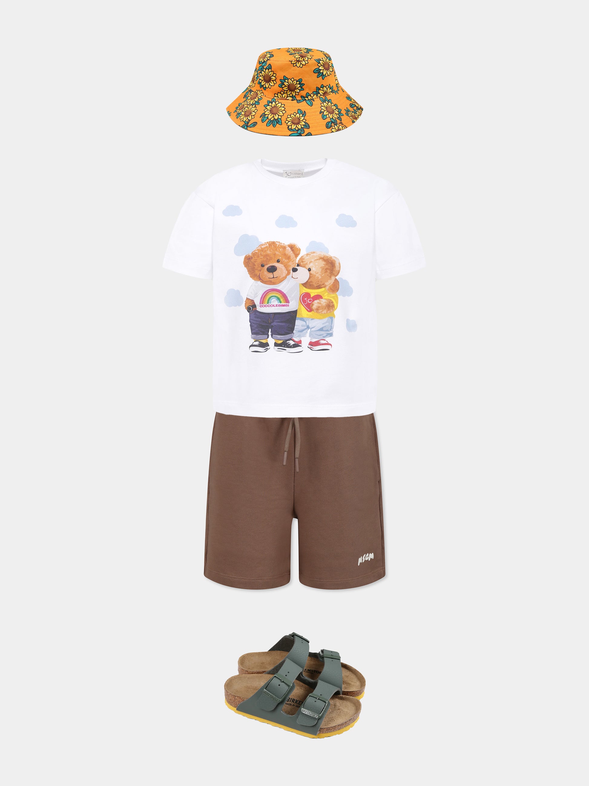 Colore: Bianco Descrizione: T-shirt bianca con nuvole celesti e orsi; realizzata in misto cotone, presenta maniche corte e girocollo a costine. Per ogni t-shirt venduta dal 3 giugno al 3 settembre 2025, CoccoleBimbi donerà il 20% a Fondazione Umberto Veronesi, a supporto della ricerca scientifica sui tumori infantili. Made in Italy Dettagli: 96% Cotone, 4% Elastan. Lavare a 30°C.
