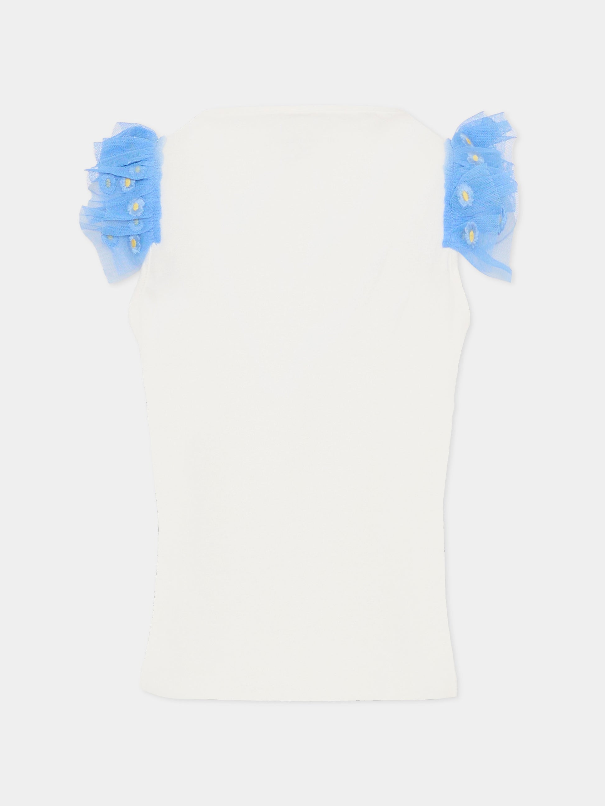 Colore: Avorio Descrizione: T-shirt avorio in cotone organico certificato GOTS, con girocollo e maniche corte con rouche in tulle azzurro e fiori ricamati. Dettagli: 100% Cotone organico. Lavare a 30°C.