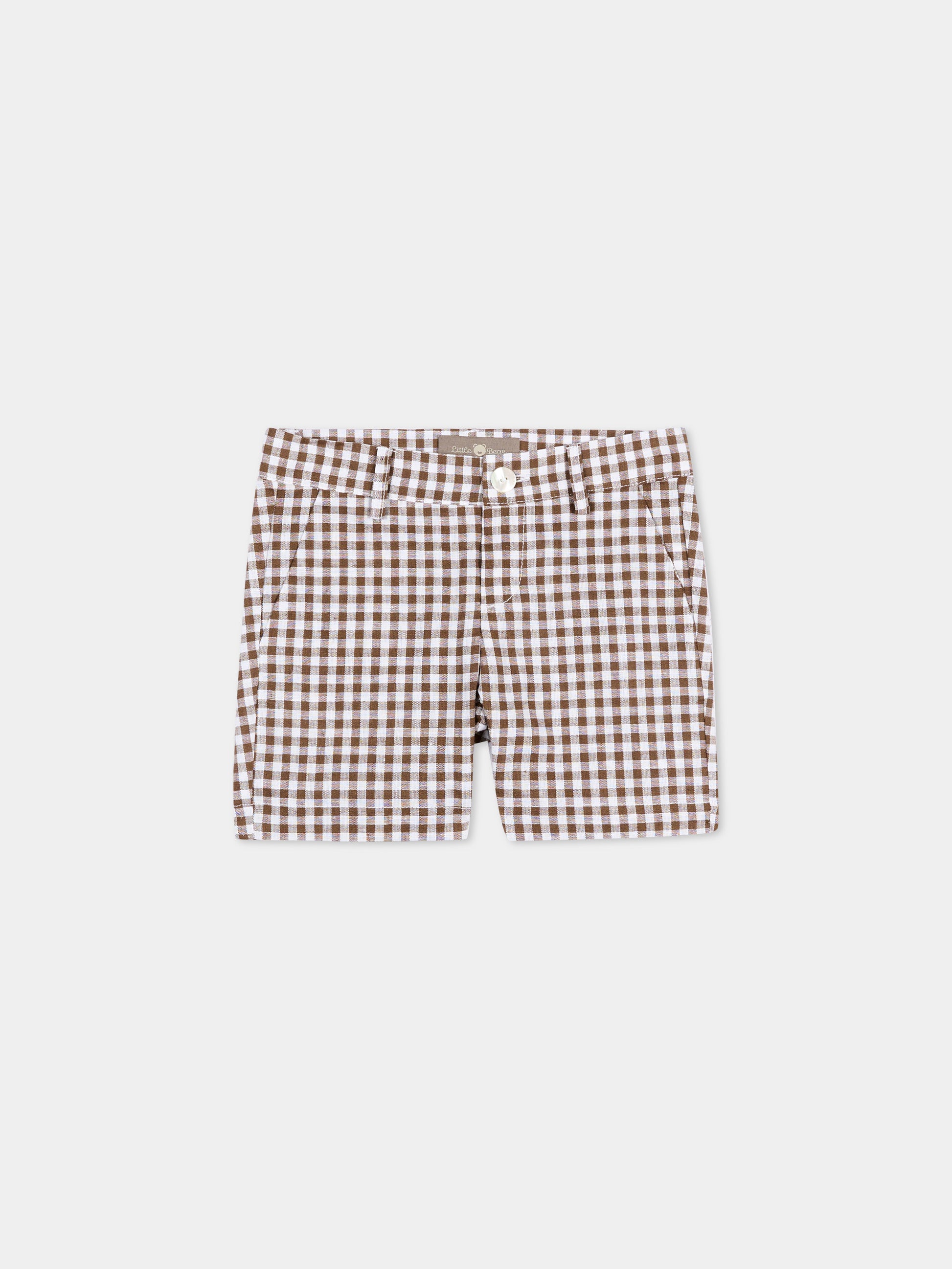 Pantaloni casual in cotone Little Bear con motivo vichy marrone e bianco dalla mano morbida. Modello corto con vita regolare dotata di passanti e chiusura frontale con bottone e zip nascosta. Vita regolabile internamente tramite elastico con bottoni per seguire la crescita del neonato senza rinunciare all’ordine della linea. Tasche oblique sul davanti e tasche a filetto sul retro completano la silhouette pulita e simmetrica.
