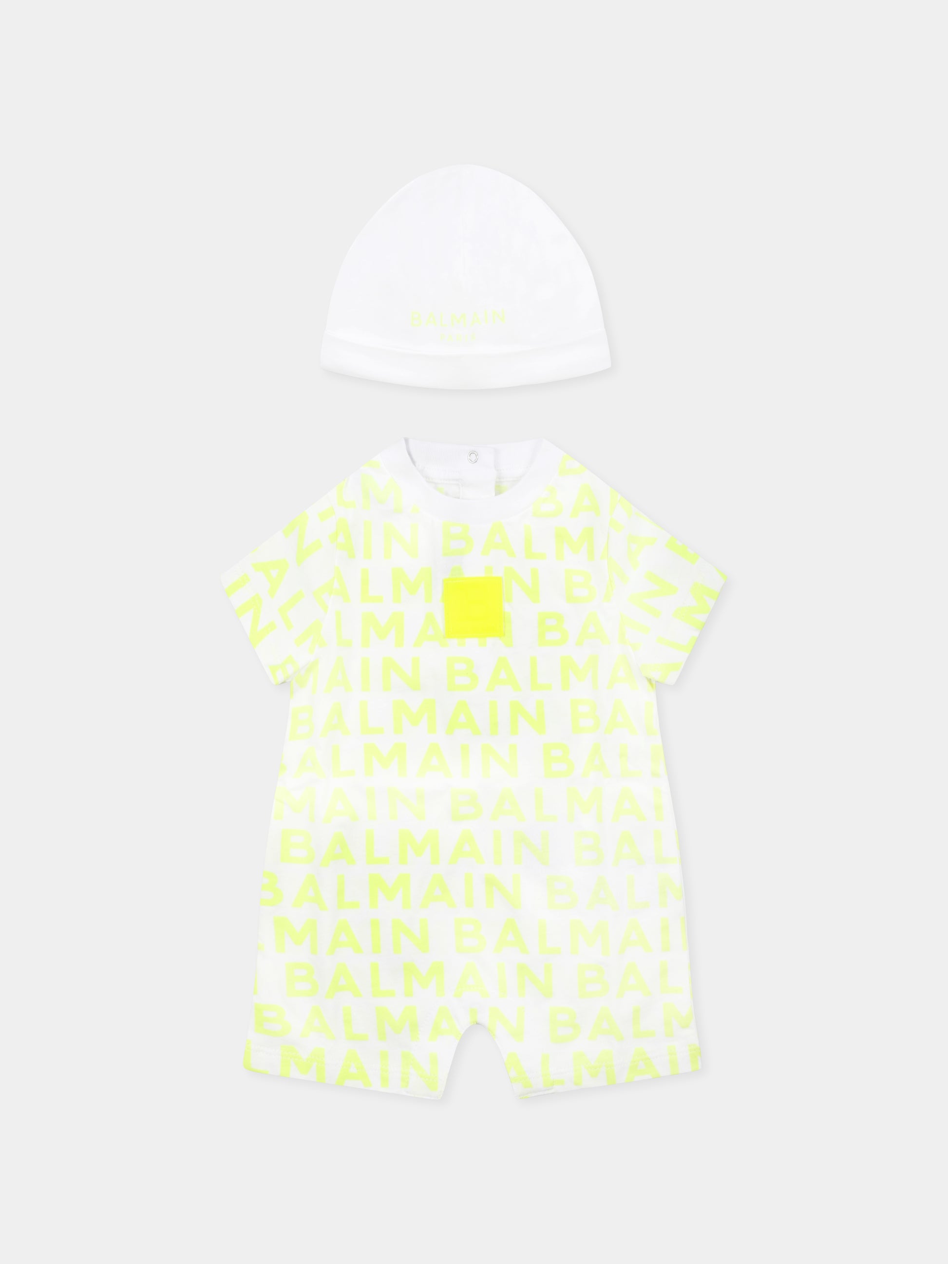 Colore: Giallo Descrizione: Pagliaccetto giallo in cotone organico, con cappello coordinato. Pagliaccetto a maniche corte, girocollo a costine, chiusura con bottoni automatici sul retro e tra le gambe. È decorato con logo giallo fluo all-over e patch frontale logata. Cappello con risvolto, decorato con logo frontale. Dettagli: 100% Cotone organico. Lavare a 30°C.
