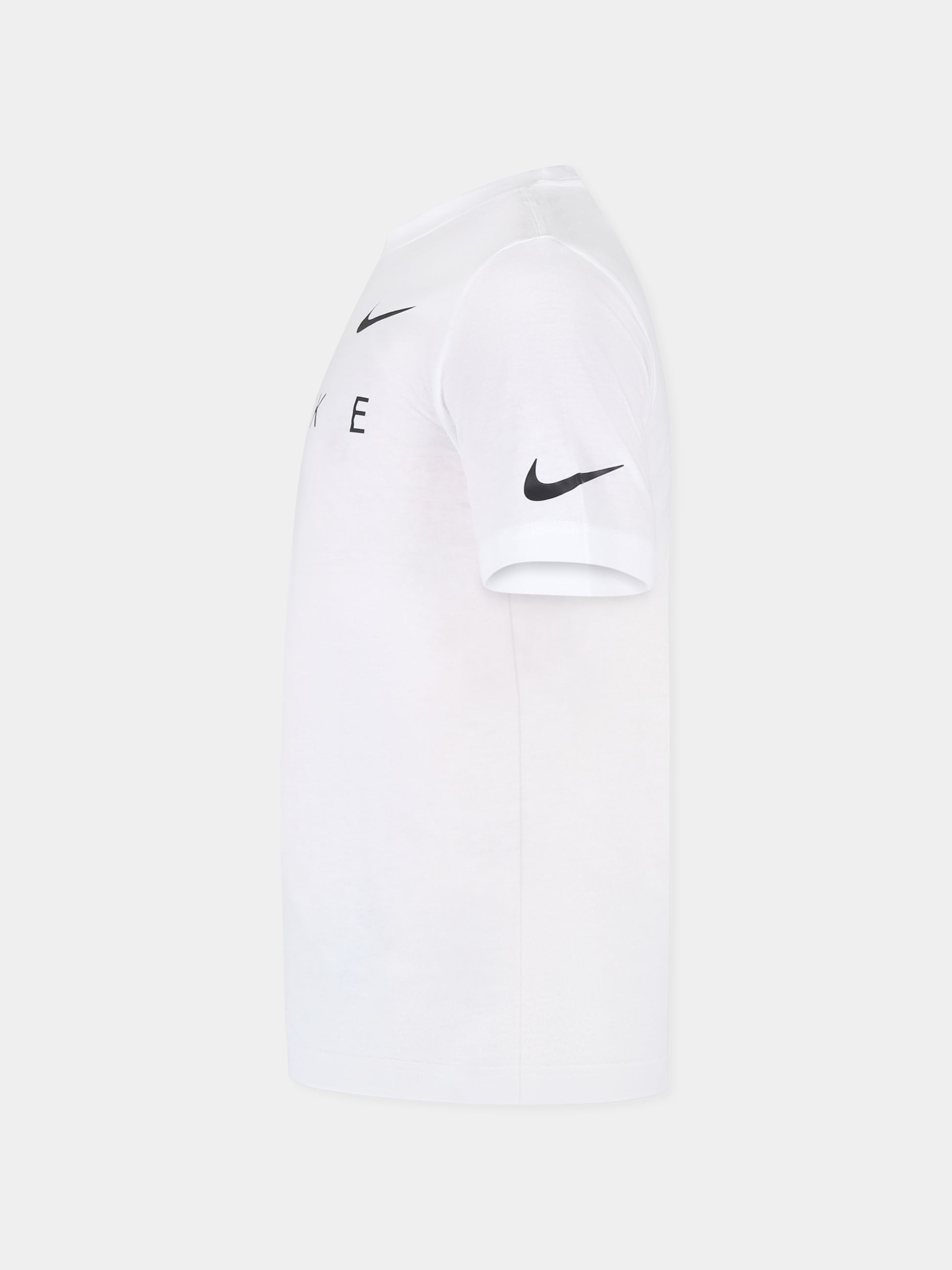 Colore: Bianco Descrizione: T-shirt bianca in misto cotone, a maniche corte e girocollo a costine. È decorata con stampa loghi sul davanti e iconico swoosh nero sulla manica. Questo capo fa parte della collezione presentata da Russel Wilson. Dettagli: 60% Cotone, 40% Poliestere. Lavare a 30°C.