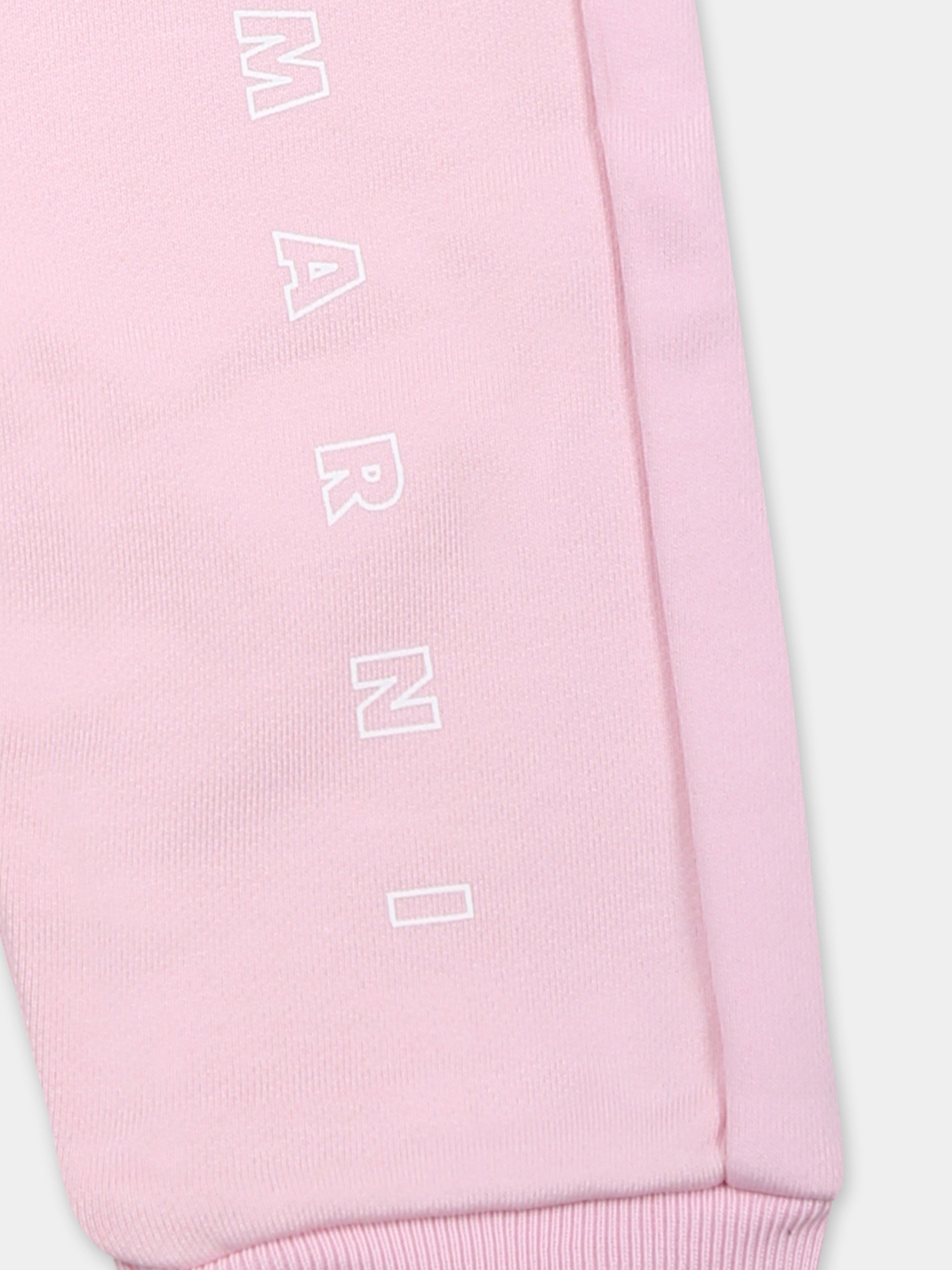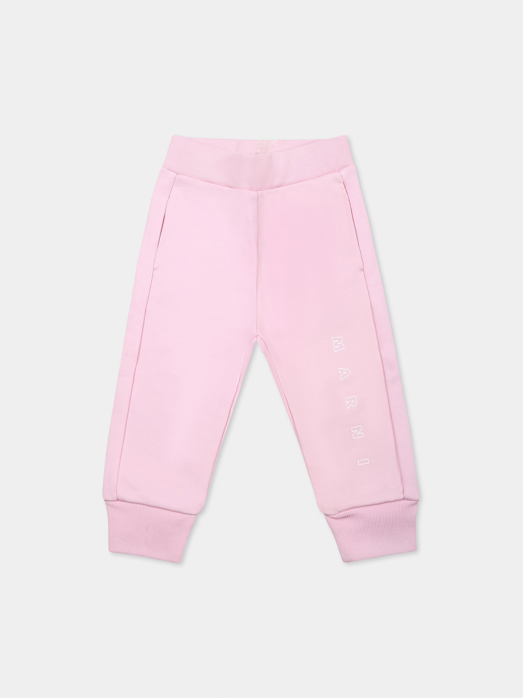 Colore: Rosa Descrizione: Pantaloni rosa in cotone garzato, con vita elasticizzata, tasche laterali e caviglie a costine. Sono decorati con logo Marni bianco su una gamba. Dettagli: 100% Cotone. Lavare a 30°C.