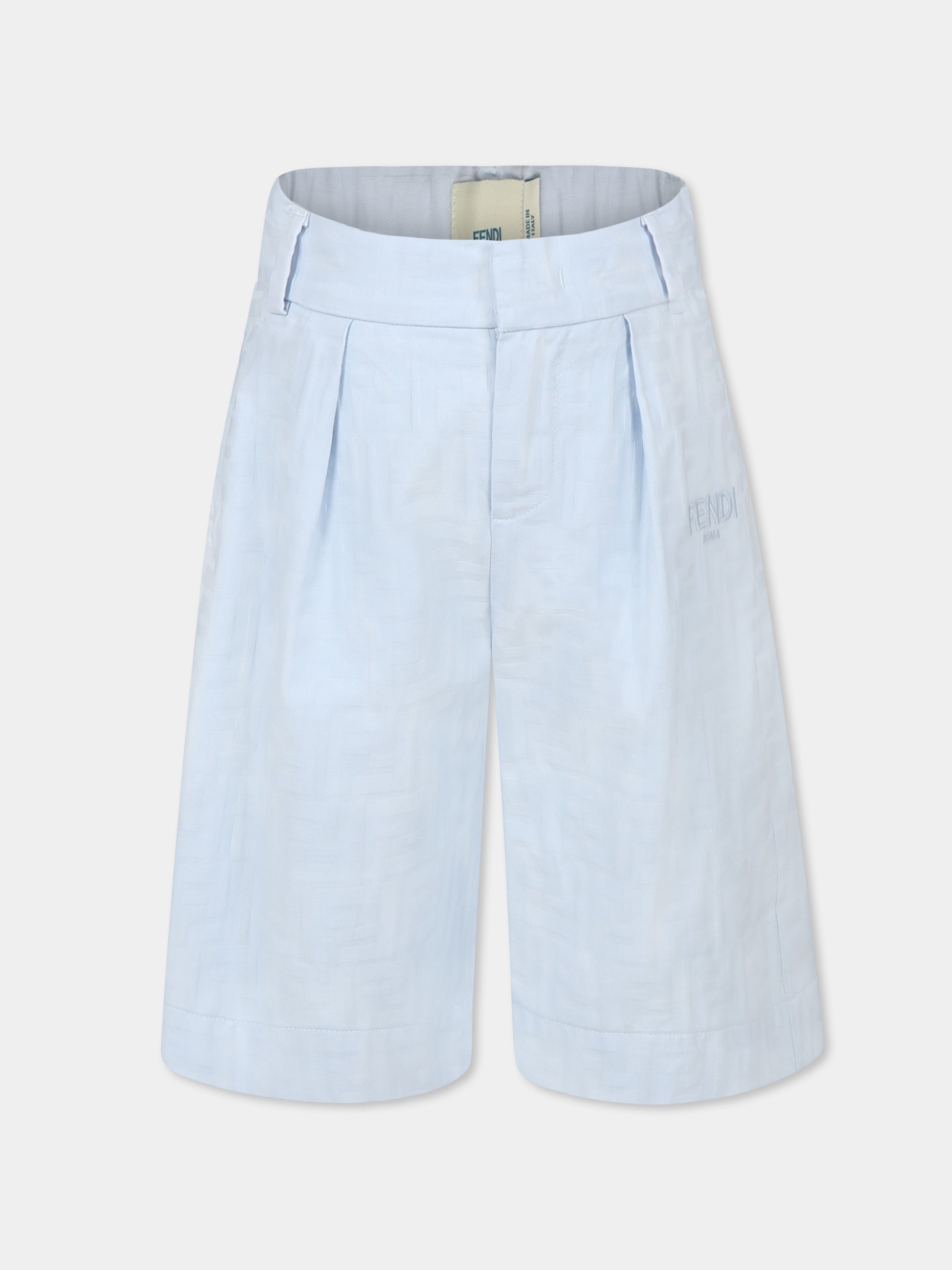 Colore: Celeste Descrizione: Shorts celesti del luxury brand italiano Fendi Kids, realizzati in cotone leggero. Presentano passanti per cintura, chiusura frontale con gancio e zip, vita regolabile grazie ad elastico interno con bottoni, tasche laterali e tasca sul retro. Le taglie 4 anni, 6 anni e 8 anni presentano la vita regolabile grazie ad elastico interno con bottoni, tasche laterali e tasca sul retro. Sono decorati con iconica FF jacquard all-over e logo Fendi Roma ricamato sulla parte anteriore. Made in Italy Dettagli: 100% Cotone. Lavare a secco.