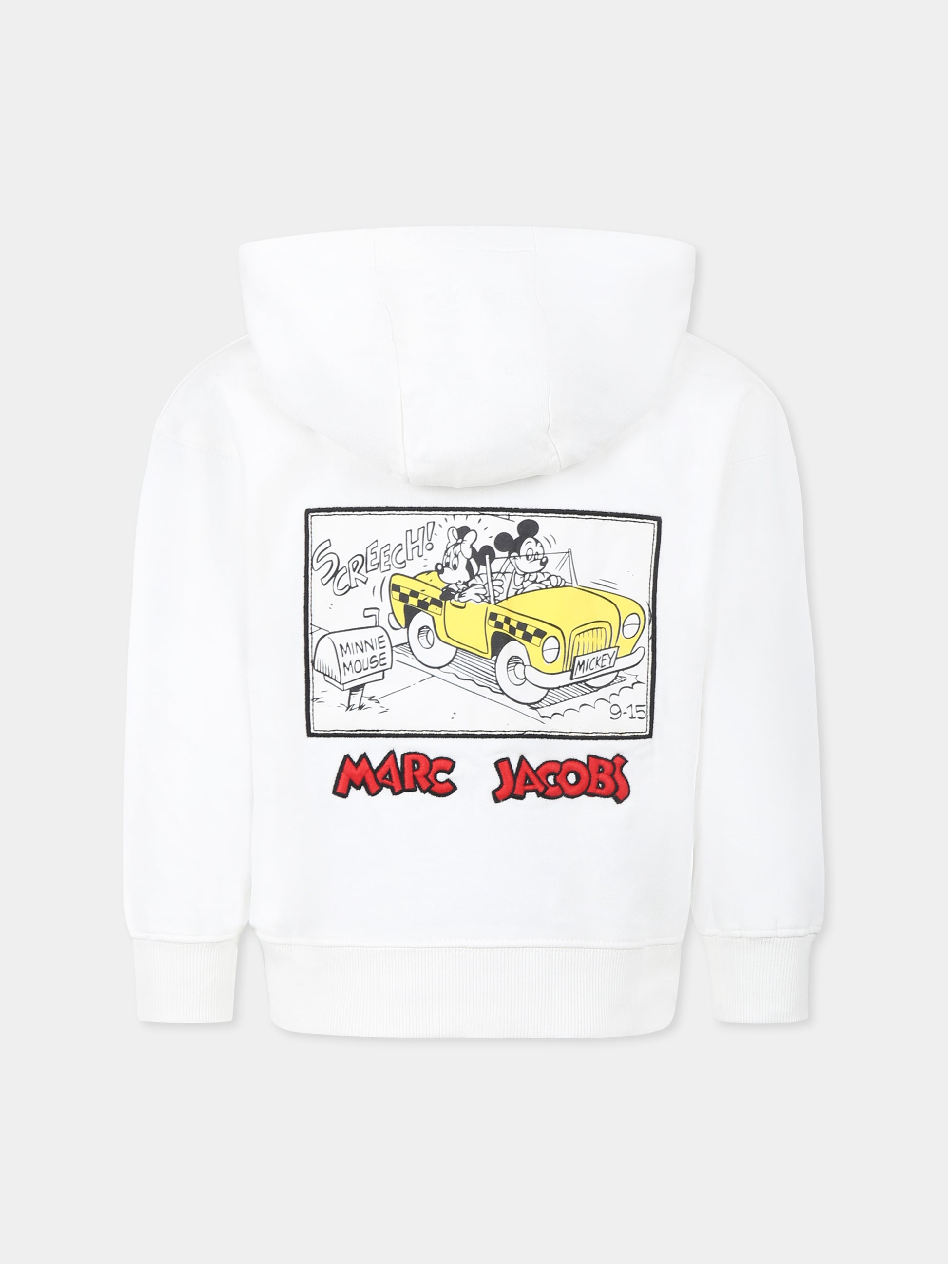 Colore: Bianco Descrizione: Felpa bianca in cotone garzato, a maiche lugnhe, con cappuccio, chuusra frontale con zip, tacshe laterali, polsini e orlo a costine. È decorata con stampa Topolino e logo sul retro, mano ricamata sul petto e scritta Mickey Mouse su una manica. È una collaborazione Disney x Marc Jacobs. Dettagli: 100% Cotone. Lavare a 30°C.