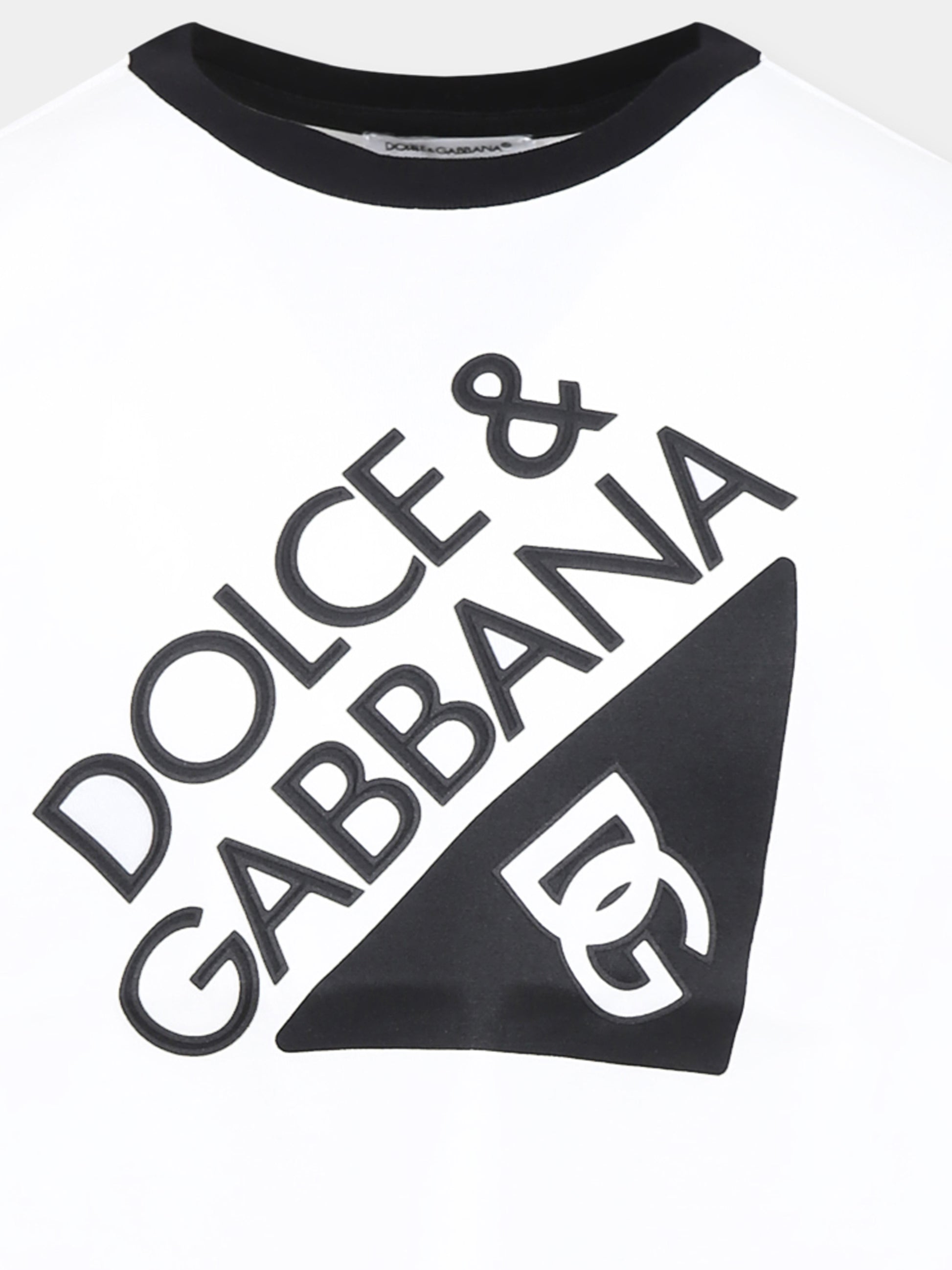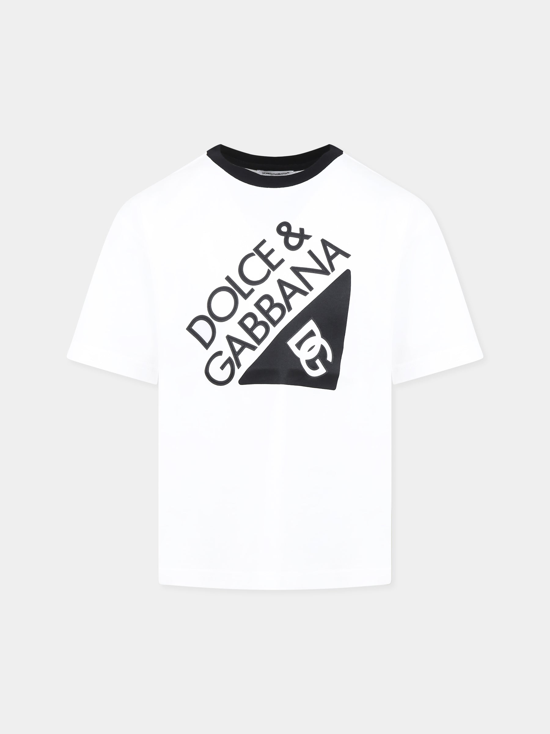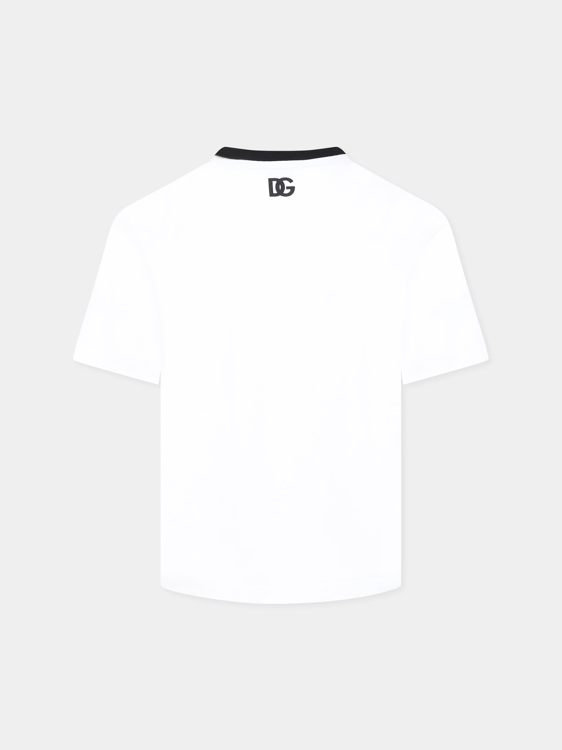 Colore: Bianco Descrizione: T-shirt bianca del luxuy brand Dolce & Gabbana Kids, realizzata in morbido jersey di cotone. Presenta maniche corte e un girocollo nero a costine. È decorata con logo Dolce & Gabbana stampato sulla parte anteriore e logo DG sul retro, per un tocco distintivo e riconoscibile. Made in Italy Dettagli: 100% Cotone. Lavare a 30°C.