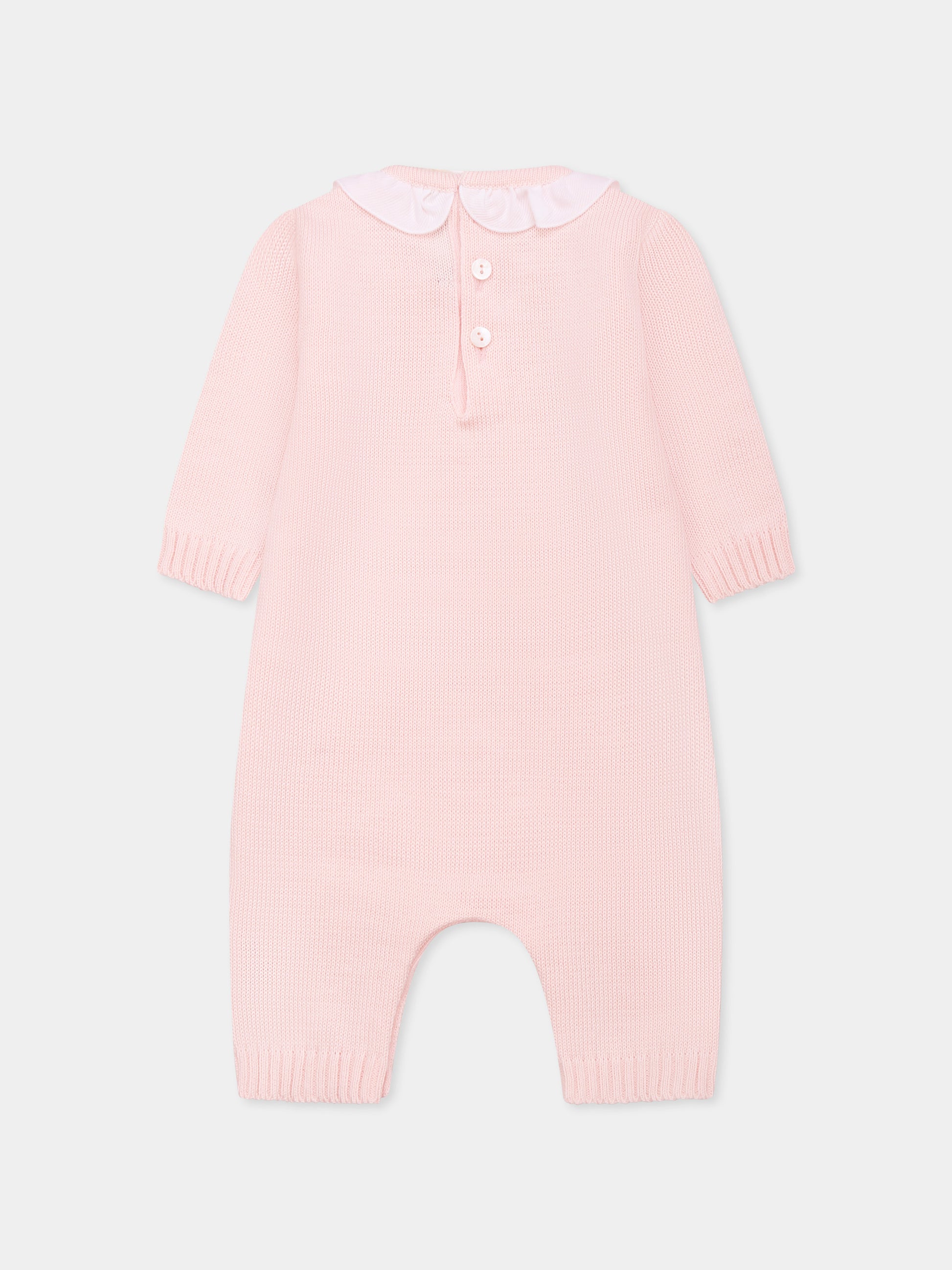 Colore: Rosa Descrizione: Tutina rosa in filo di cotone, a maniche lunghe, con girocollo con rouche bianca, bottoni in madreperla sul retro e tra le gambe, polsini e caviglie a costine. È decorata con pois ricamati sulla parte anteriore. Made in Italy Dettagli: 100% Cotone. Lavare a mano.