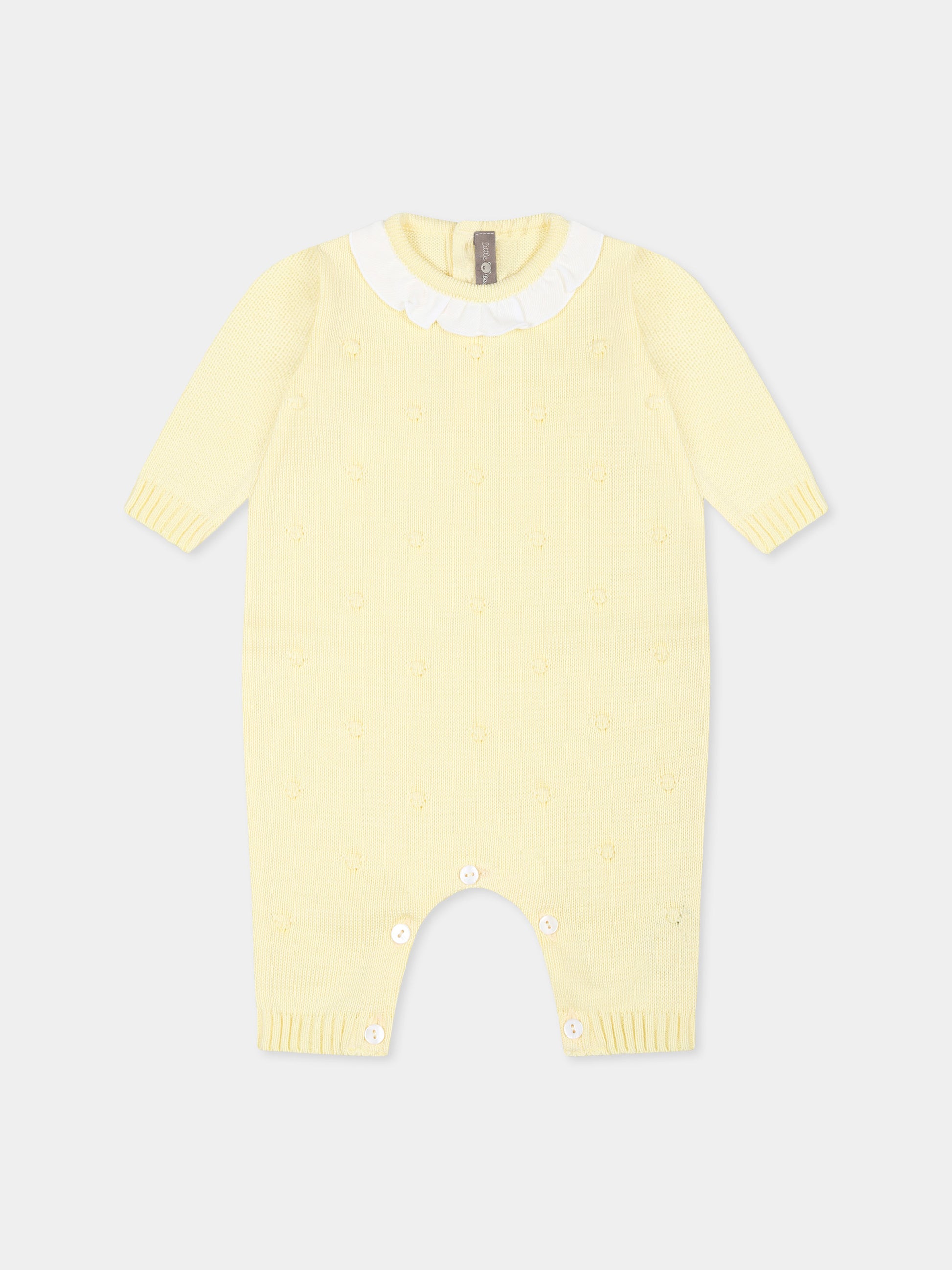 Colore: Giallo Descrizione: Tutina gialla in filo di cotone, a maniche lunghe, con girocollo con rouche bianca, bottoni in madreperla sul retro e tra le gambe, polsini e caviglie a costine. È decorata con pois ricamati sulla parte anteriore. Made in Italy Dettagli: 100% Cotone. Lavare a mano.
