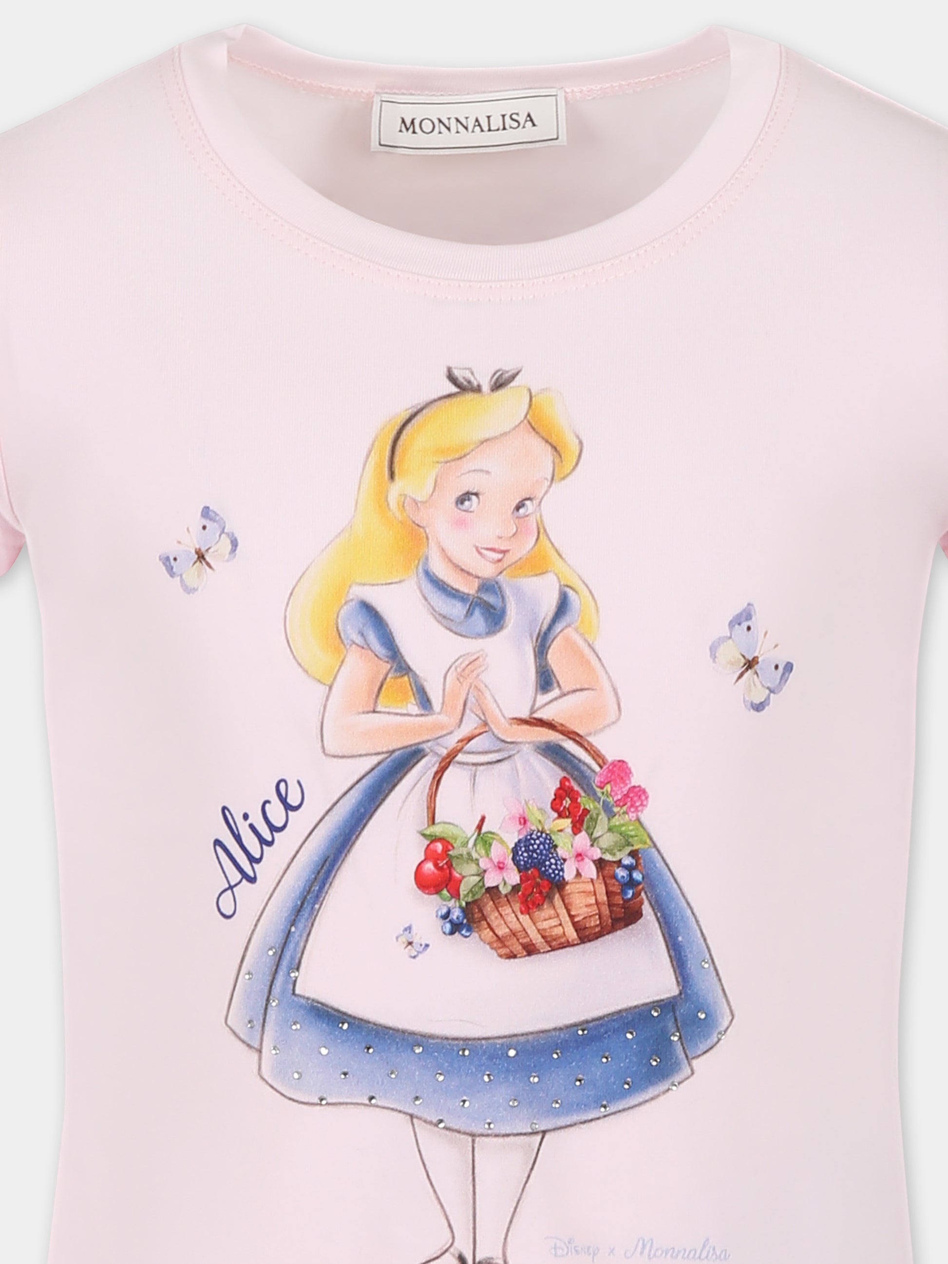 Colore: Rosa Descrizione: T-shirt rosa in misto cotone, con maniche corte e girocollo a costine. È decorata con Alice nel Paese dell Meraviglie e strass sulla parte anteriore. È una collaborazione Disney x Monnalisa. Made in Italy Dettagli: 95% Cotone, 5% Elastan. Lavare a 30°C.