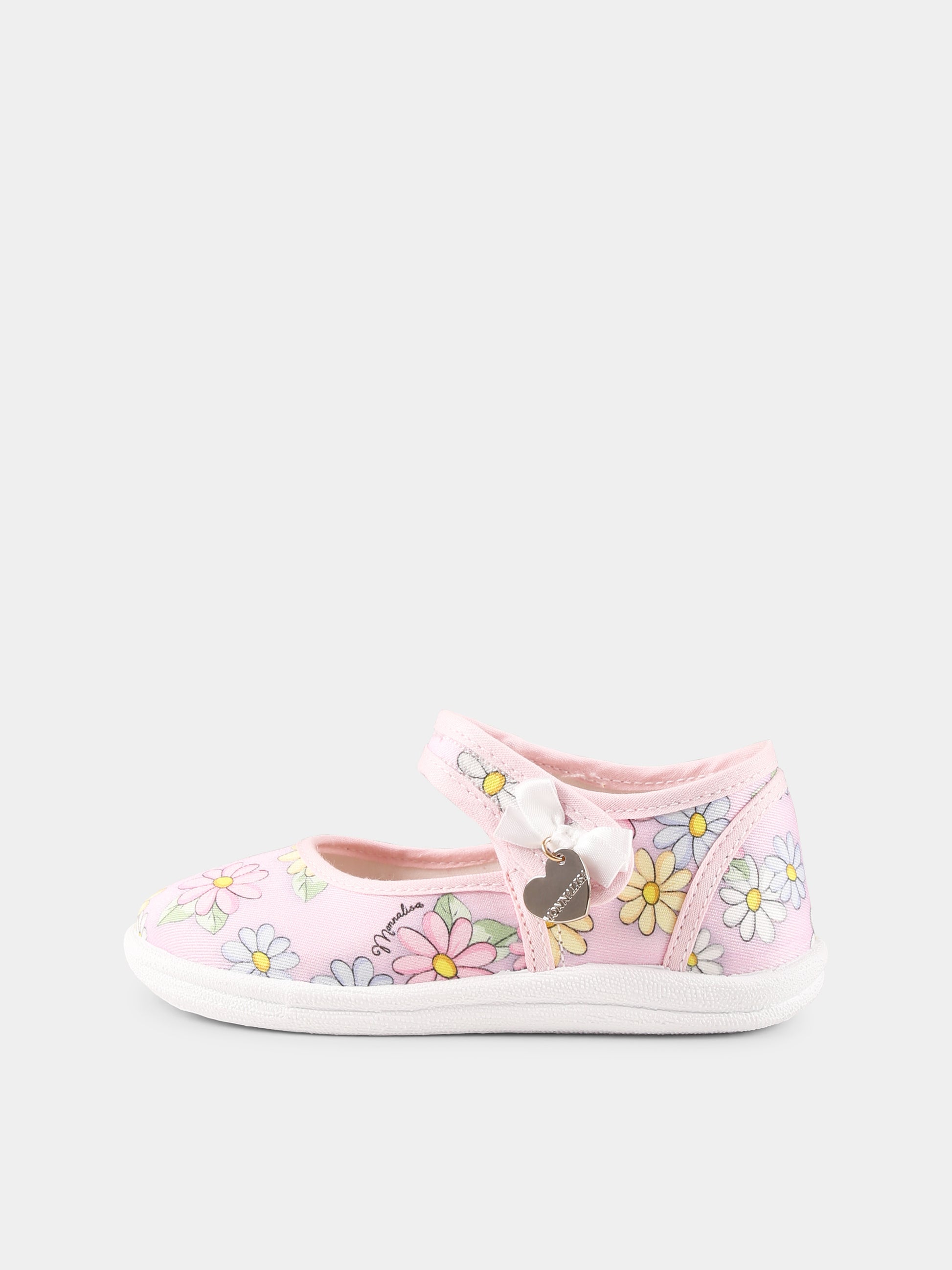 Colore: Rosa Descrizione: Ballerine rosa in tessuto, con suola in gomma, cinturino alla caviglia, chiusura a strappo e punta tonda. Sono decorate con margherite all-over e con fiocco e cuore logato su un lato. Made in Italy Dettagli: 100% Cotone.