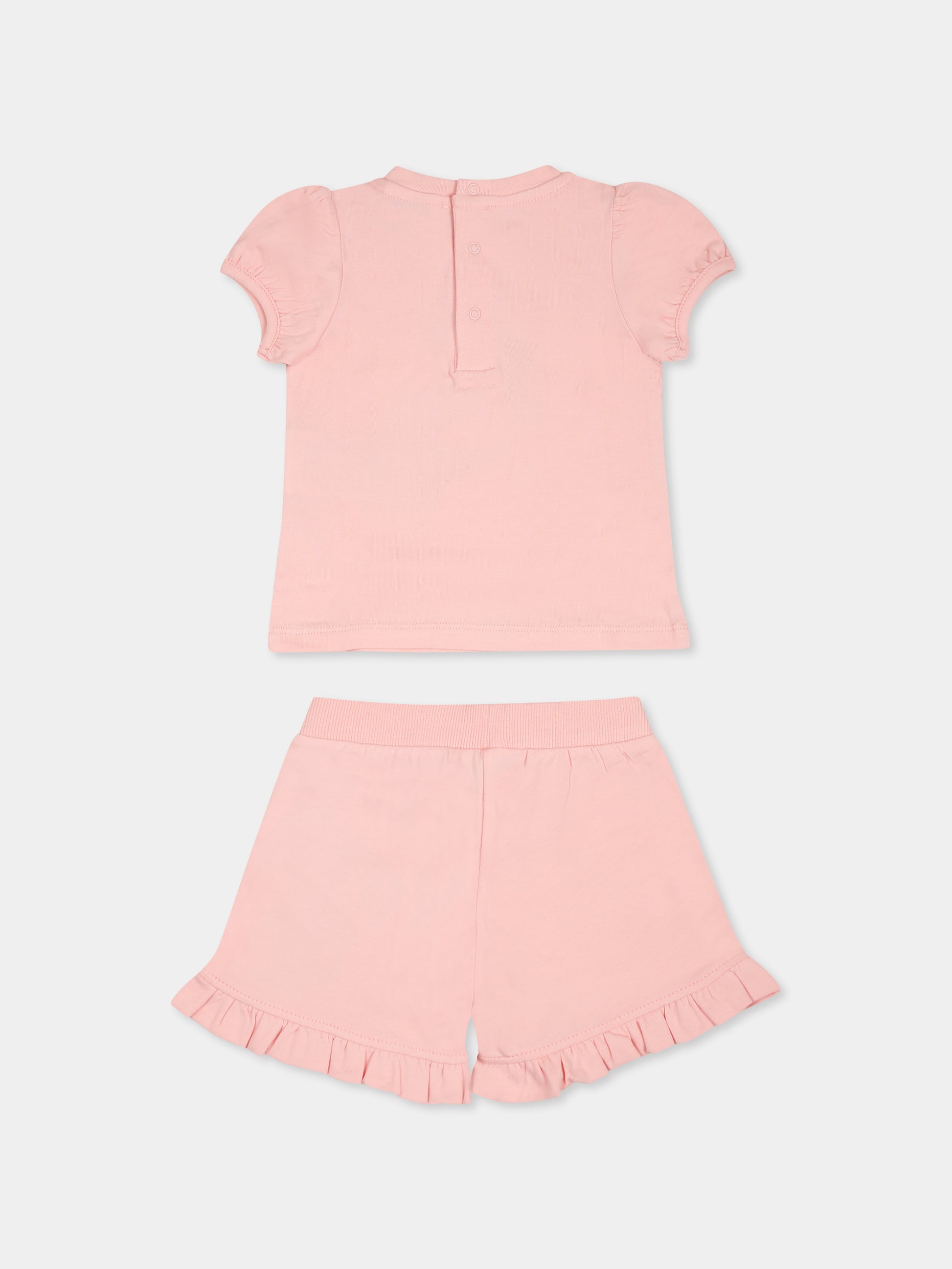 Colore: Rosa Descrizione: Completo rosa del brand Moschino Kids, in misto cotone, composto da t-shirt e shorts. T-shirt a maniche corte a paloncino, girocollo a costine e chiusura con bottoni automatici sul retro; shorts con vita elasticizzata e orlo con rouche. È decorato con Teddy Bear, scritta Toy e logo, sulla parte anteriore. Dettagli: 95% Cotone, 5% Elastan. Lavare a 30°C.
